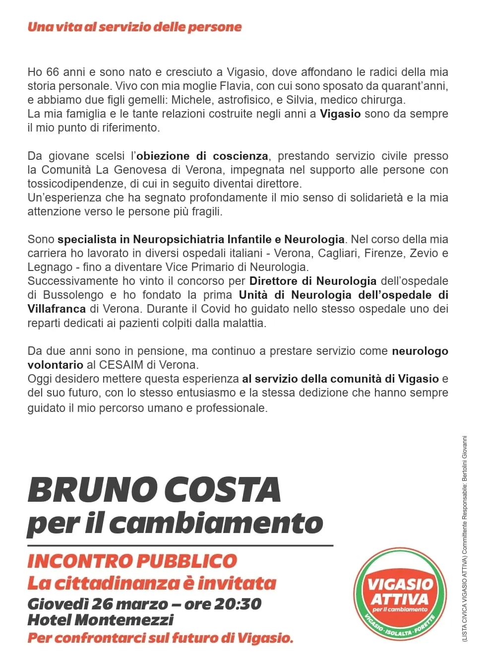 Giovedì 26 marzo si terrà il primo 𝐢𝐧𝐜𝐨𝐧𝐭𝐫𝐨 𝐩𝐮𝐛𝐛𝐥𝐢𝐜𝐨 con 𝐁𝐫𝐮𝐧𝐨 𝐂𝐨𝐬𝐭𝐚, candidato sindaco, e la lista 𝐕𝐢𝐠𝐚𝐬𝐢𝐨 𝐀𝐭𝐭𝐢𝐯𝐚.